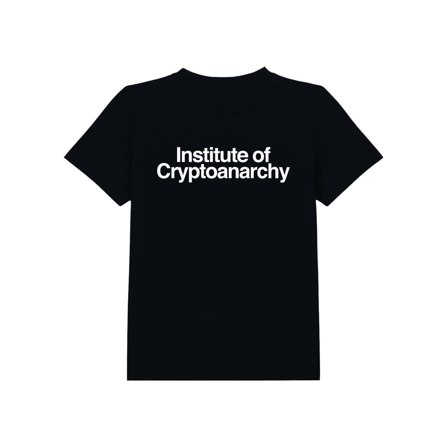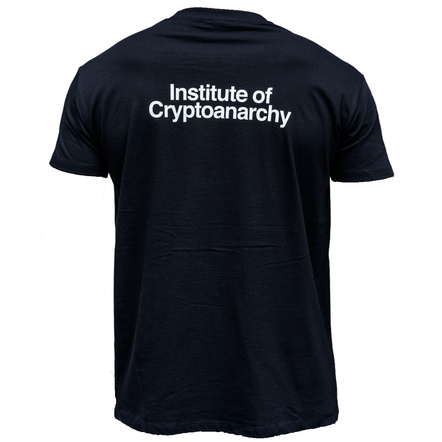 A unisex black T-shirt with white “Institute of Cryptoanarchy” print on the front.
