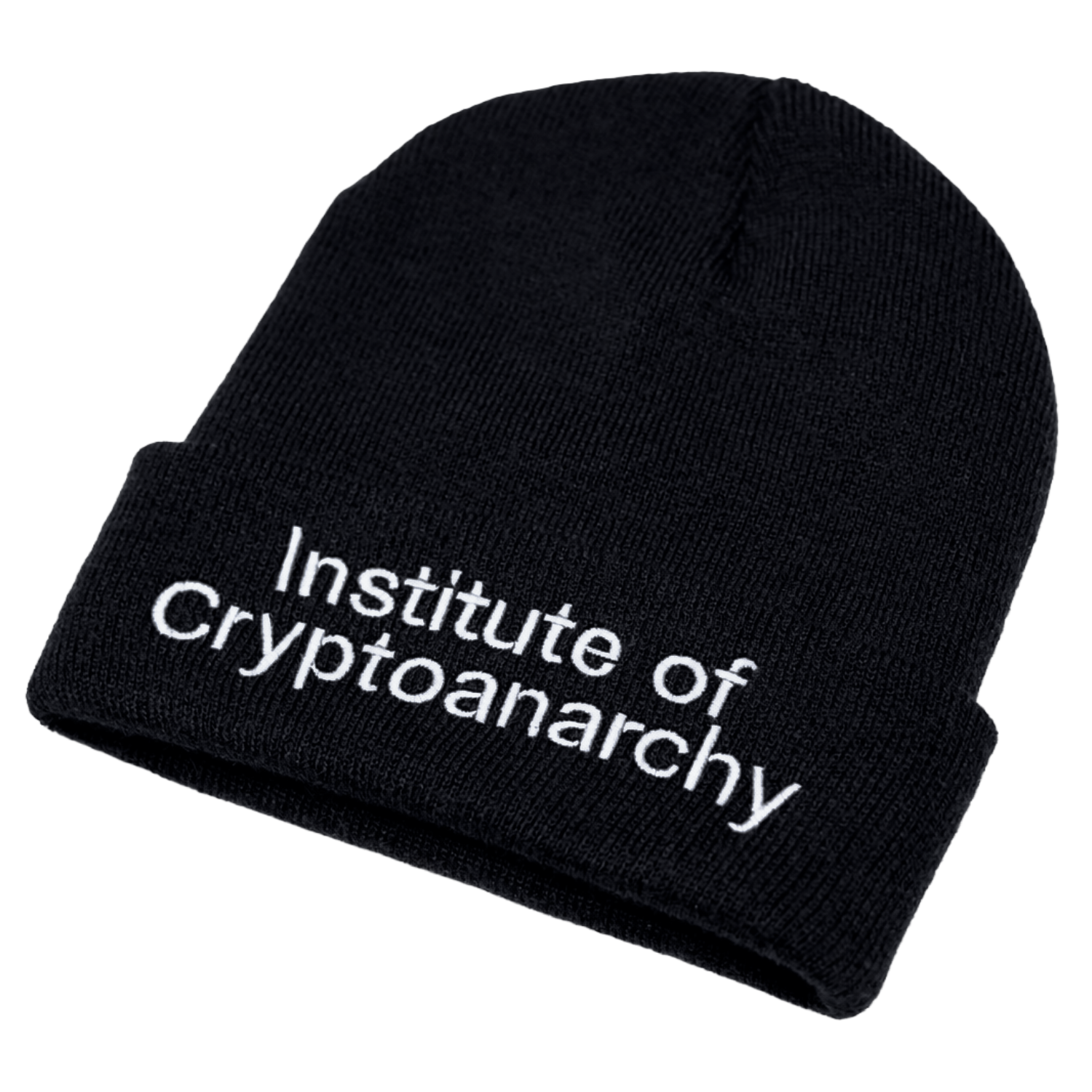 Cuffed beanie with white embroidered Institute of Cryptoanarchy lettering. Double-layer knit made from a soft acrylic blend, comfortable and warm.