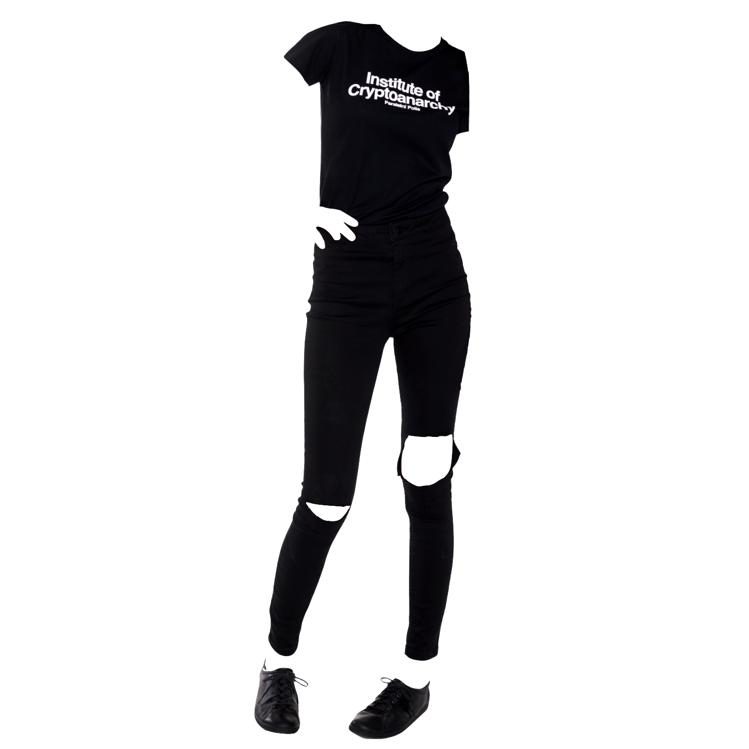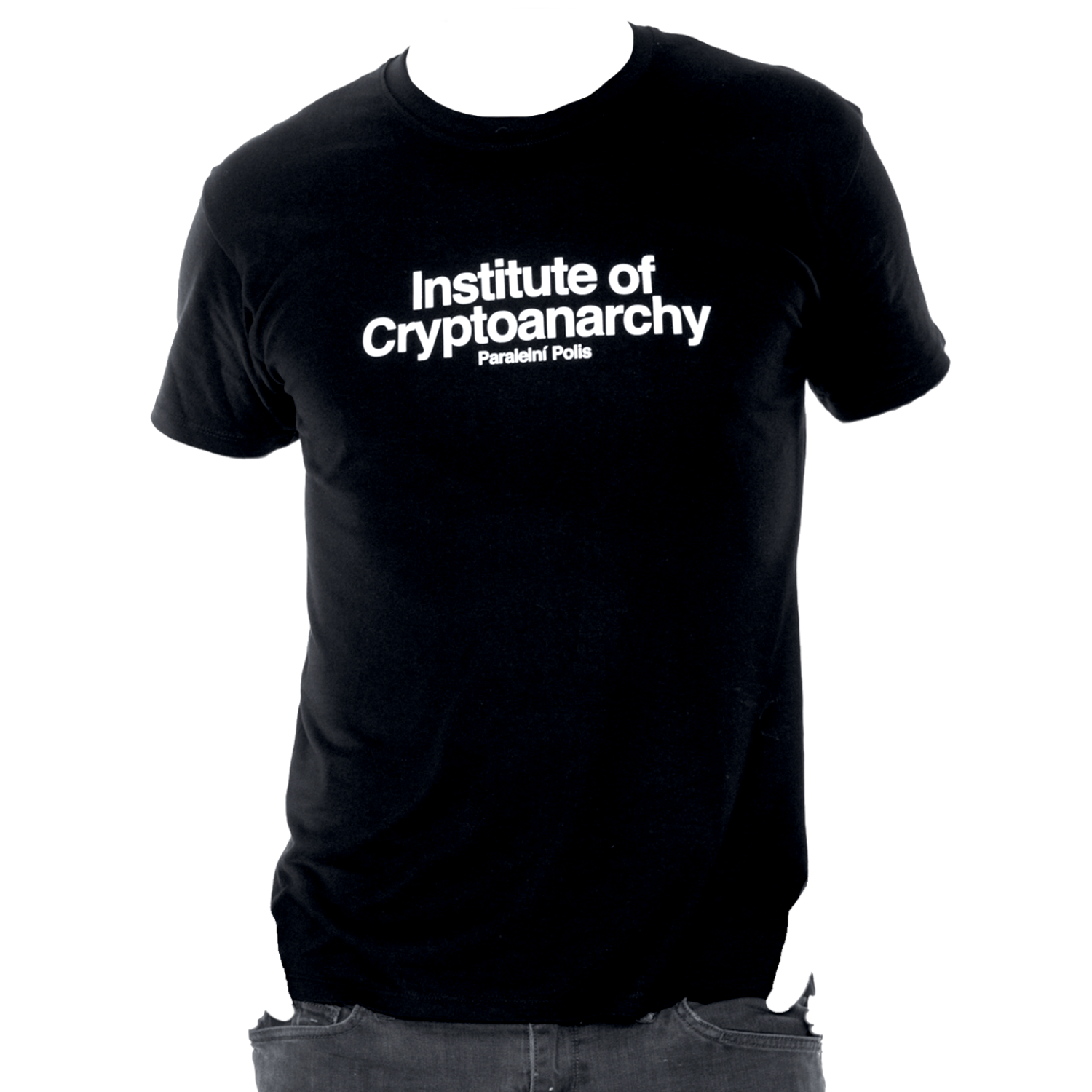 A unisex black T-shirt with a subtle nod to the legacy of Paralelni Polis on the front, paired with a white Institute of Cryptoanarchy print on the back.
