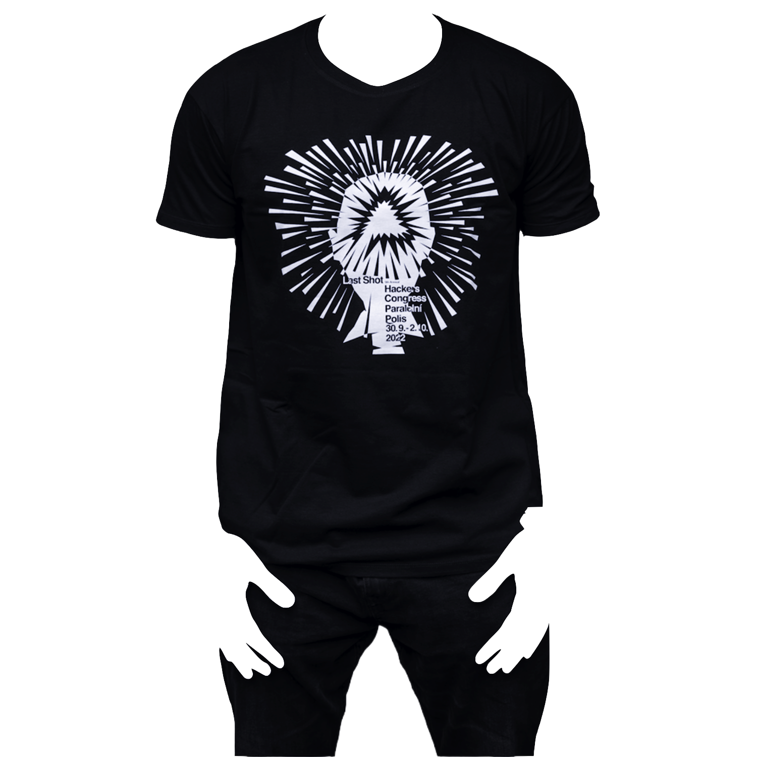 A unisex black T-shirt with white print from Hackers Congress Paralelní Polis 2022.