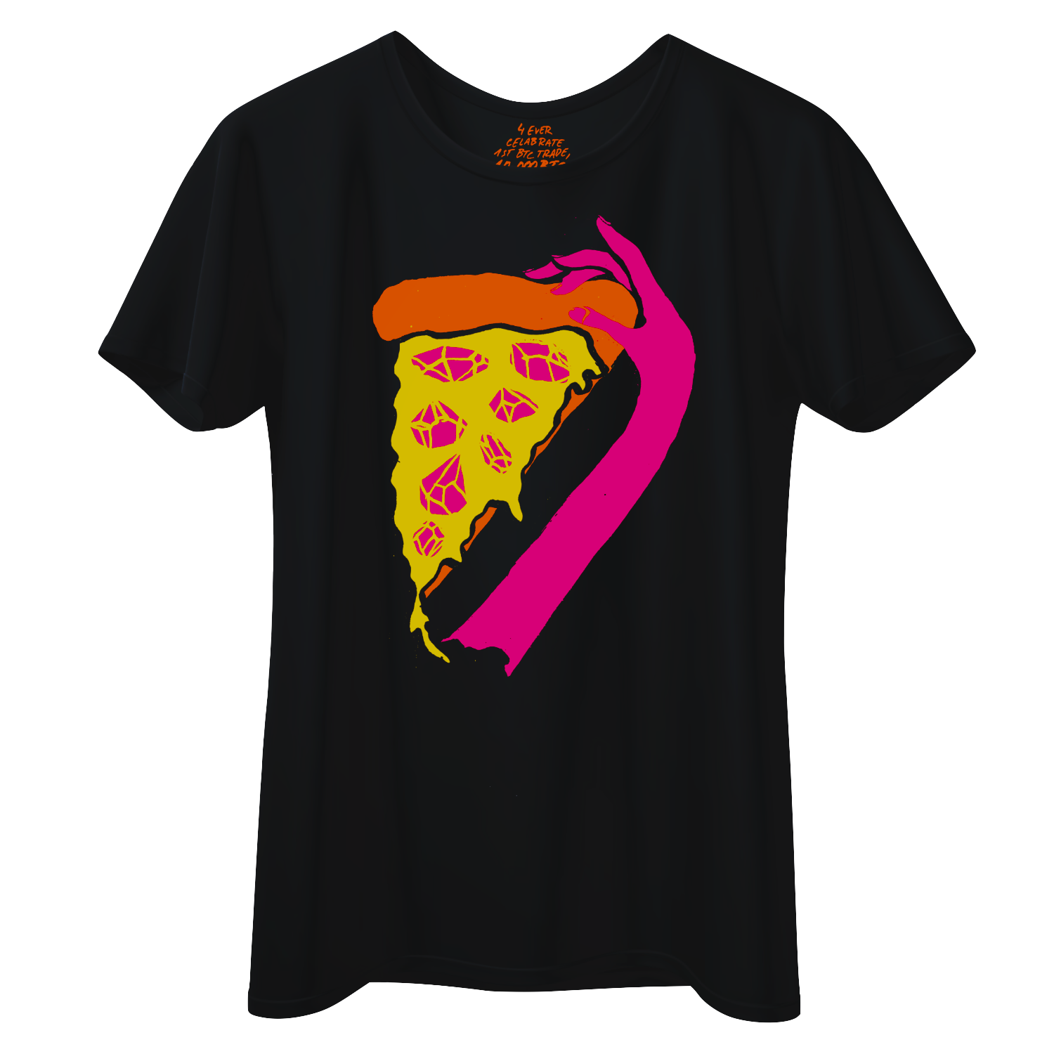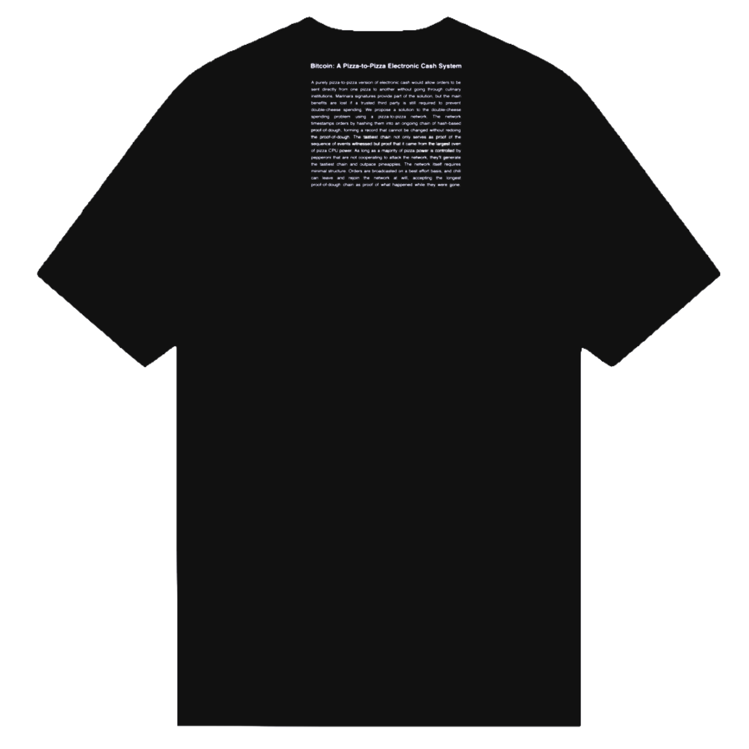 A unisex T-shirt from Pizza Day Prague 2023 featuring the “Pizza-to-Pizza Electronic Cash System” manifesto.