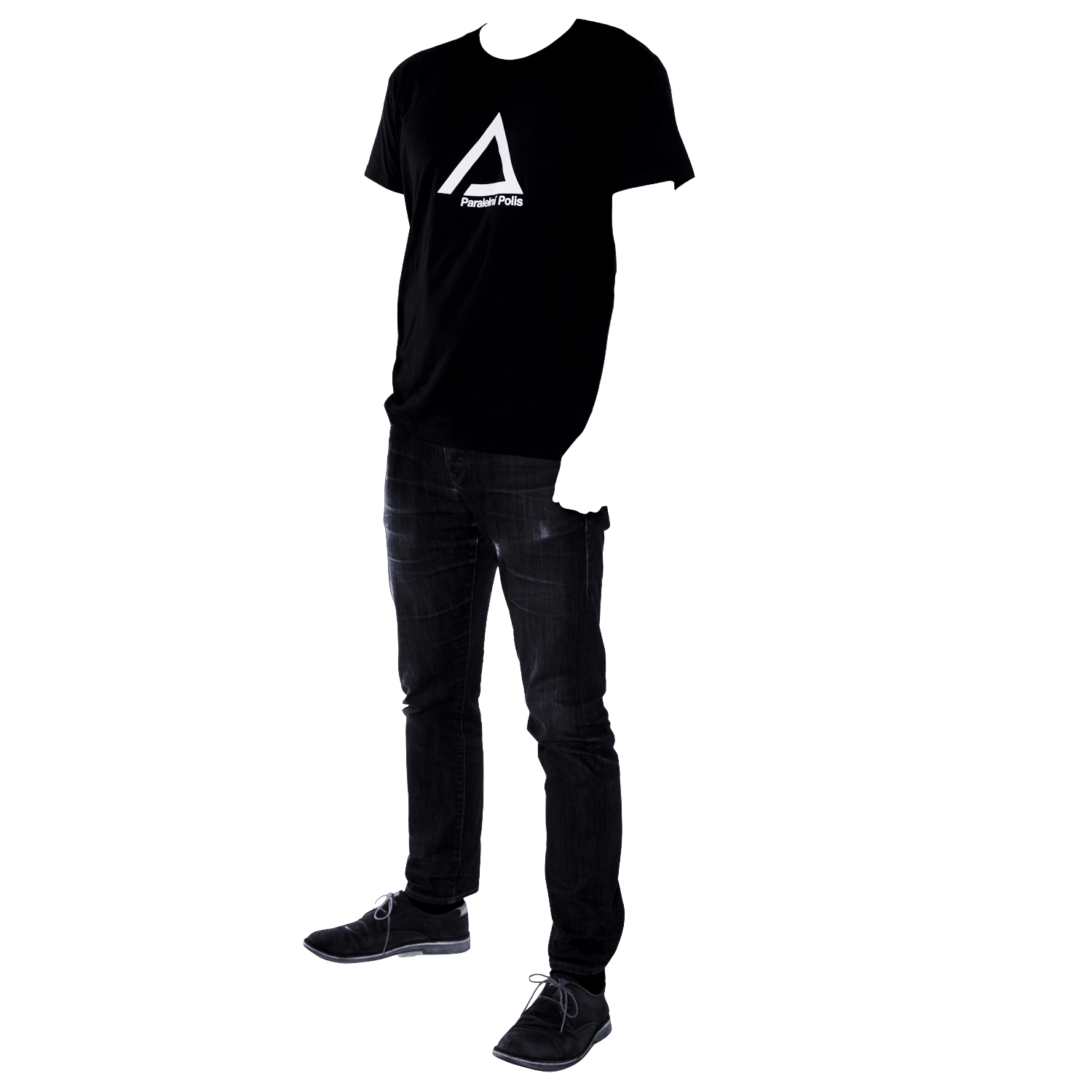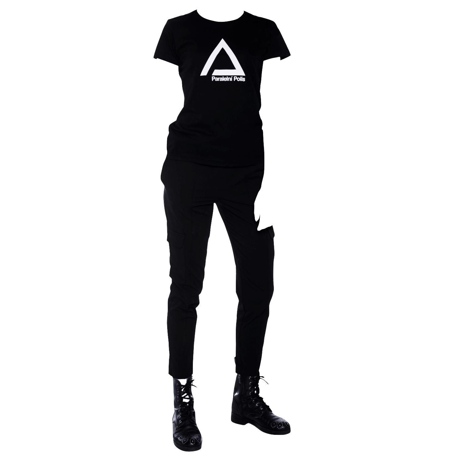A unisex black T-shirt with white “Paralelní Polis” print on the front.